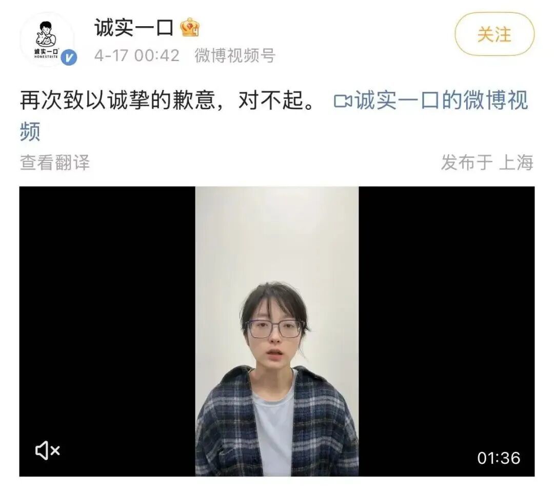 4月16日晚,诚实一口官方发布道歉声明,称涉事主播言论“极度不尊重我们的品牌代言人,严重违背品牌价值观与基本底线”。声明表示,该言论仅为涉事主播个人不当表达,绝不代表品牌立场,事发后已第一时间关停涉事直播间、开除涉事主播,并严厉问责相关管理团队,全面升级合作主播管理。