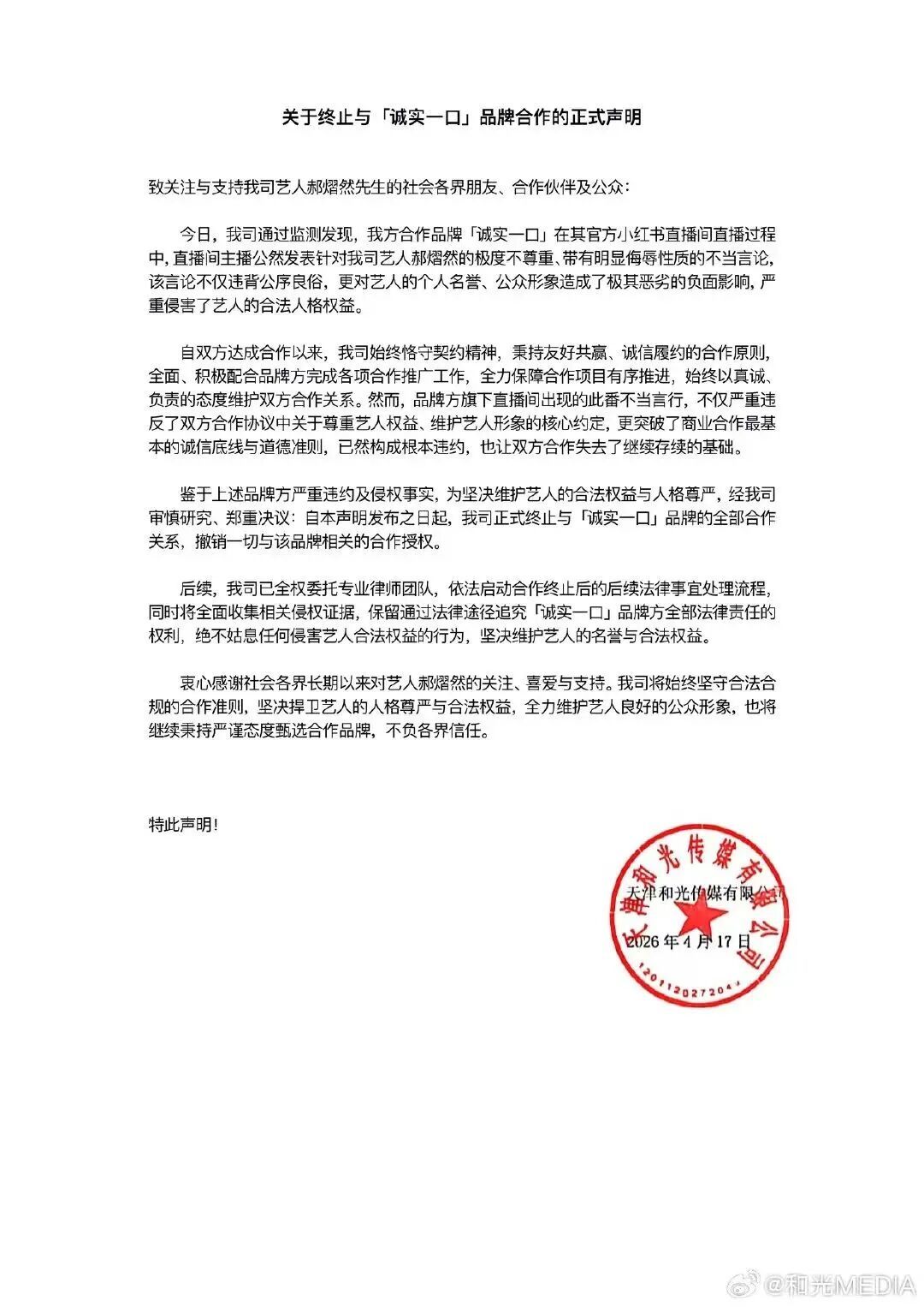 和光传媒指出,品牌方旗下直播间公然发表针对艺人郝熠然的“极度不尊重、带有明显侮辱性质的不当言论”,严重违反了双方合作协议中关于尊重艺人权益、维护艺人形象的核心约定,已构成根本违约。公司已委托律师团队依法启动后续法律事宜,保留追究法律责任的权利。
